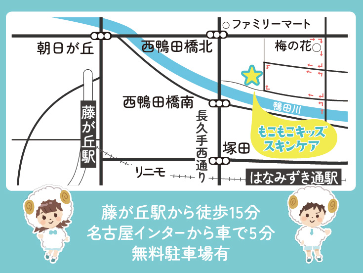 少しわかりずらい場所にあるのでGoogleマップで【もこもこキッズスキンケア】と検索してご来店ください♪